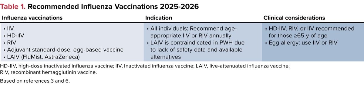 One of the best modalities for prevention of influenza includes vaccination along with good hand hygiene and maintenance of daily healthy habits. Data have demonstrated that PWH who are on ART and have normal or near-normal CD4+ counts mount appropriate responses to influenza vaccinations; however, those with advanced disease or low CD4+ counts may not develop the same protection. Published literature has demonstrated the effectiveness and immunogenicity of the influenza vaccine in PWH. Fine and colleagues demonstrated that vaccination was the most effective method for preventing influenza-like illnesses (ILIs) during an outbreak at a facility in PWH with CD4+ counts greater than 100 cells/mm3 and HIV-1 RNA less than 30,000 copies.4 Similarly, data from a randomized clinical trial demonstrated that influenza vaccination was efficacious in prevention of laboratory-confirmed influenza infection in PWH who were naive to ART.5 Recommendations from the CDC and Advisory Committee on Immunization Practices (ACIP) advise that individuals 6 months of age and older should receive the age-appropriate annual influenza vaccine as long as no contraindications exist.6 See Table 1 for flu vaccination recommendations.3,6