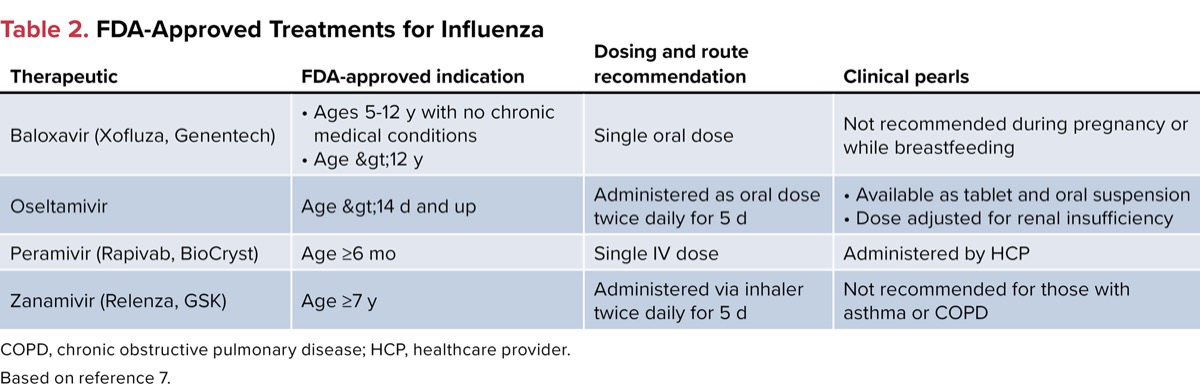 | Table 2. FDA-Approved Treatments for Influenza COPD, chronic obstructive pulmonary disease; HCP, healthcare provider. Based on reference 7. | |||