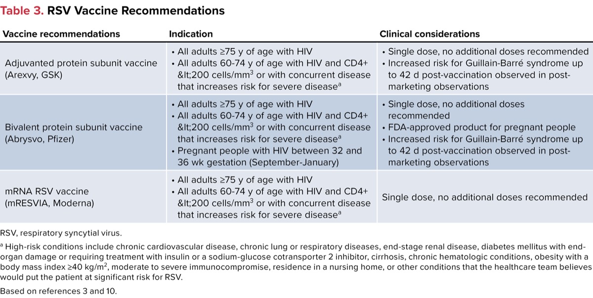 The first RSV vaccines were approved by the FDA in May 2023 for adults 60 years of age and older. With the approval of these vaccines, ACIP updated its recommendations to include RSV vaccination in adults 75 years of age and older and those 60 to 74 years who are at high risk for severe disease. Risk for severe disease includes conditions such as chronic cardiovascular disease, chronic lung or respiratory diseases, end-stage renal disease, diabetes mellitus with end-organ damage or requiring treatment with insulin or a sodium-glucose cotransporter 2 inhibitor, cirrhosis, chronic hematologic conditions, obesity with a body mass index of 40 kg/m2 or higher, moderate to severe immunocompromise, residence in a nursing home, or other conditions that the healthcare team believes would put the patient at significant risk for RSV. PWH are considered at risk if they meet any of the following criteria: having a CD4+ count lower than 200 cells/mm3, having an AIDS-defining illness (or have had in the past), or are currently not on ART.3,10 See Table 3 for RSV vaccination recommendations.3,10