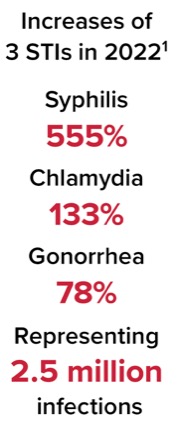 Rates of STIs including syphilis, gonorrhea, and chlamydia have increased significantly over the last few years, with 2.5 million new cases in 2022 alone representing increases of 555% for syphilis, 133% for chlamydia, and 78% for gonorrhea. When looking at the effect these increases have on coinfection with HIV, data have demonstrated that about 6% of sexually acquired HIV is linked to those 3 infections. There is also a significant economic burden associated with this increase, with the lifetime medical costs of new HIV infections totaling $800 million for approximately 1,800 new infections.1