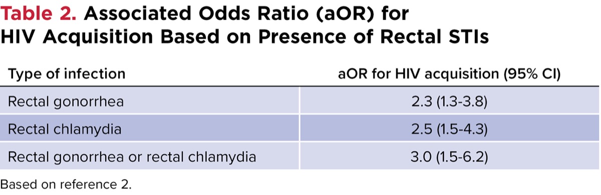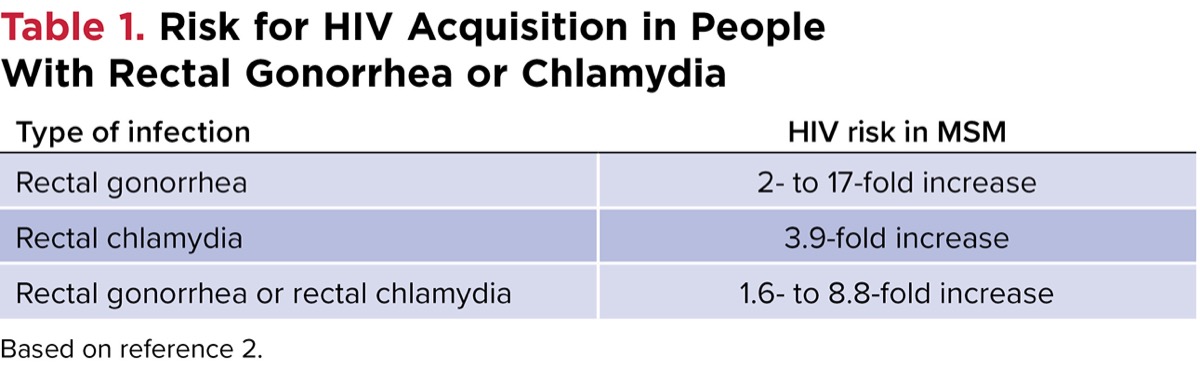 Historical data have demonstrated that individuals who have a history of rectal gonorrhea or chlamydia have an increased risk for acquiring HIV (Table 1). Additional data have estimated that about 10% of new HIV infections in MSM could be linked to gonorrhea/chlamydia infections, accounting for about 2,600 new HIV cases annually.1