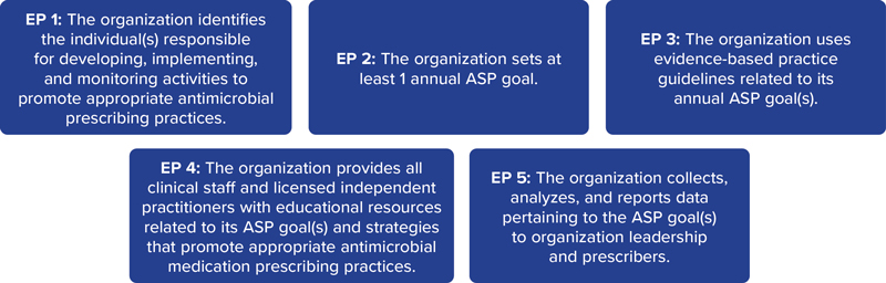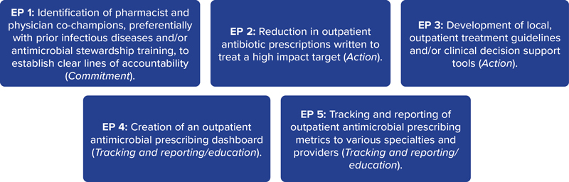 The sheer number of outpatient antimicrobial prescriptions coupled with the high rates of inappropriate prescribing and rising incidence of outpatient resistance rates underscore the importance of the development and implementation of ambulatory ASPs on the national, state, and local level. Consequently, in January 2020, The Joint Commission (TJC) requirements for ASPs in the ambulatory setting (TJC Standard MM.09.01.03) went into effect with 5 new elements of performance addressing ASPs in the outpatient setting (Figure 1).20 Furthermore, the CDC released the “Core Elements of Outpatient ASP,” which overlap with TJC elements of performance and include: