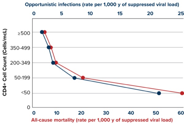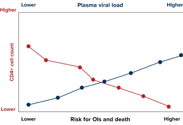 HIV is estimated to be diagnosed in nearly 40 million people worldwide, which underscores the importance of early diagnosis and treatment of OIs to improve patient outcomes.8 A greater CD4+ cell count and a lower plasma viral load are associated with a lower risk of OIs and death9 (Figures 1 and 2).