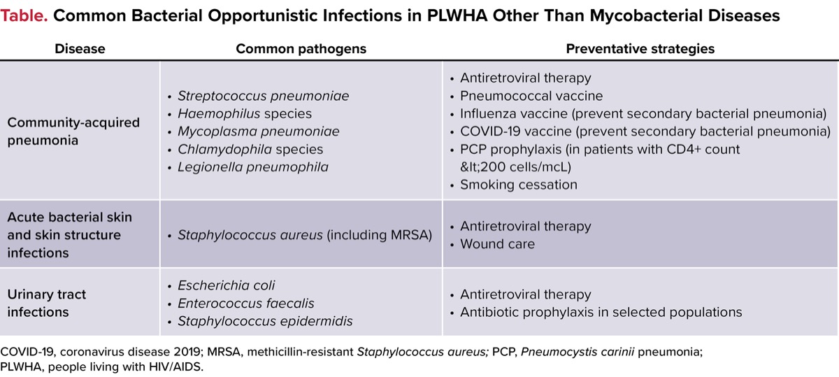 The common pathogens and preventative strategies for bacterial pneumonia, acute bacterial skin and skin structure infections (ABSSSIs), and UTIs are shown in the Table.12 The purpose of this review is to discuss bacterial OIs and antibiotic use in people with HIV/AIDS, excluding mycobacterial disease.