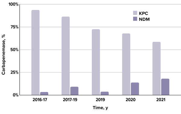 KPC has been recognized as the predominant carbapenemase in the United States, while the prevalence of MBLs have remained relatively low.5,6 However, the epidemiology of carbapenemases throughout the United States has significantly changed throughout the past decade (Figure 1).7-9 In the CRACKLE-2 prospective cohort study, conducted across 49 US hospitals between 2016 and 2017, 93% of carbapenemase-producing CRE harbored KPC-type carbapenemases, while only 3% were positive for NDMs.7 A subsequent study from 2017 to 2019 reported that KPCs accounted for 86% of isolates, and NDM comprised 9%.8 More recently, an analysis from 2019 to 2021 demonstrated that although KPC remained the predominant carbapenemase, its prevalence declined from 74% to 57%, coinciding with a notable increase in MBLs from 4% to 20%.9