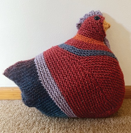 My sister-in-law, Andrea, knitted me an emotional support chicken in my favorite colors: red and purple. To be honest, I think it was more for her emotional support than mine, but it is adorable and has pride of place on my bureau. I had never heard of emotional support chickens, so I Googled them—and yes, they are a thing!