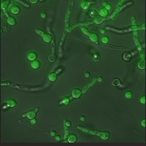 Aspergillus fumigatus strains in which stress granules—intracellular condensates that form in response to stress and are essential for cell survival—are fluorescently labeled and become visible following heat shot.  Image by Dr. Marina Rocha
