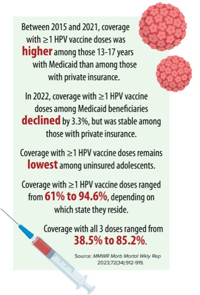 The CDC’s National Immunization Survey-Teen surveillance database monitors trends in vaccination coverage at the national, state and local levels, and found that for the first time in a decade, HPV vaccination coverage in 2022 did not increase among teens ages 13 to 17 years. In addition, the survey also found that teens born in 2008 have lower HPV vaccination coverage than previous birth cohorts, which Cassandra Pingali, MS, MPH, an epidemiologist with the CDC, said indicates the “COVID-19 pandemic has affected routine coverage of young teens” (MMWR Morb Mortal Wkly Rep 2023;72[34]:912-919).