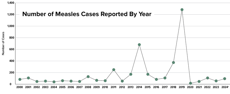 Considering the rise in measles cases globally, the risk for importations is almost unavoidable, and as of April 11, 2024, 121 cases were reported by 18 U.S. jurisdictions: Arizona, California, Florida, Georgia, Illinois, Indiana, Louisiana, Maryland, Michigan, Minnesota, Missouri, New Jersey, New York City, New York state, Ohio, Pennsylvania, Virginia and Washington. Sixty-five patients were hospitalized, according to the CDC. Most of the cases and hospitalizations were among children younger than 5 years.