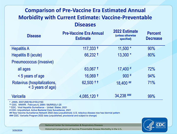 The accomplishment has been seen, not just in the United States but throughout the world. Since 1974, 154 million deaths have been prevented through vaccination. This figure includes 146 million children: 101 million were younger than 12 months of age. Forty percent of the decline in global infant mortality since 1974 is due to vaccination (Lancet 2024;403[10441]:2307-2316).