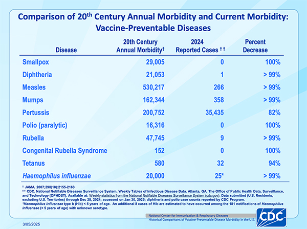According to the CDC, vaccination has prevented the deaths of millions of people in the 20th century in the United States alone. As an example, measles took more than 530,000 people in the 1900s versus none in 2024. (See tables. There were three deaths in 2025 among unvaccinated people; two were children. They are not reflected in these tables.)