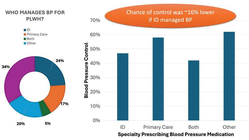HIV care in the United States presents several barriers but also many opportunities for high-quality CVD prevention care. In some parts of the country, HIV providers—many of whom are trained as infectious disease specialists—prefer to focus on HIV and ID care, while leaving the rest to a primary care provider (PCP). Elsewhere, HIV clinicians practice a model of comprehensive primary care for their patients. The relative benefits of each approach can be debated, but in either model, it is important for someone to take responsibility for CVD prevention care. Does it matter who? In an interesting study examining this question,4 Okeke and colleagues suggest that if an ID specialist is managing your blood pressure (BP), your chances of control are lower than if a PCP is doing it (Figure). Although I know many amazing HIV providers who do a great job with hypertension, it is a reminder that life is not just about antiretroviral drug resistance and syphilis.