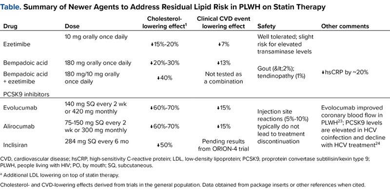| Table. Summary of Newer Agents to Address Residual Lipid Risk in PLWH on Statin Therapy | |||||