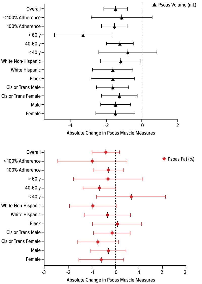 A subanalysis examined changes in muscle quality, quantity and function among people living with HIV who were enrolled in SLIM LIVER (abstract 799). Among the 46 participants for whom muscle measurements were available, the mean age was 50 years and their mean BMI was 35.5 kg/m2. Among people living with HIV taking semaglutide in SLIM LIVER, muscle volume decreased with weight loss, with no significant change in muscle fat or physical function, according to Dr. Ditzenberger.