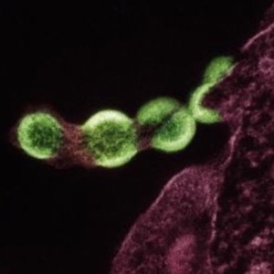 Colorized transmission electron micrograph of multiple HIV-1 virus particles (green) budding from a cell projection from an H9 cell (burgundy). Image captured at the NIAID Integrated Research Facility in Fort Detrick, Maryland. Credit: NIAID